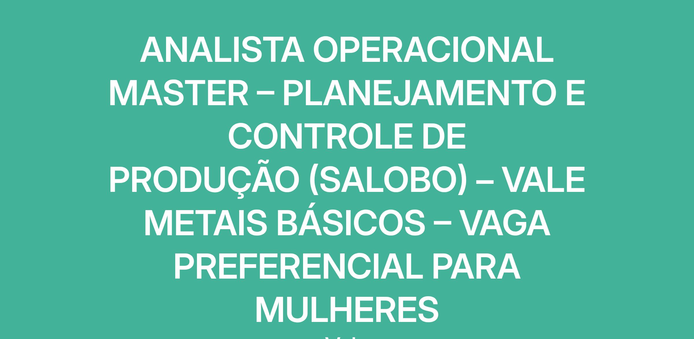 ANALISTA OPERACIONAL MASTER – PLANEJAMENTO E CONTROLE DE PRODUÇÃO (SALOBO) – VALE METAIS BÁSICOS – VAGA PREFERENCIAL PARA MULHERES
